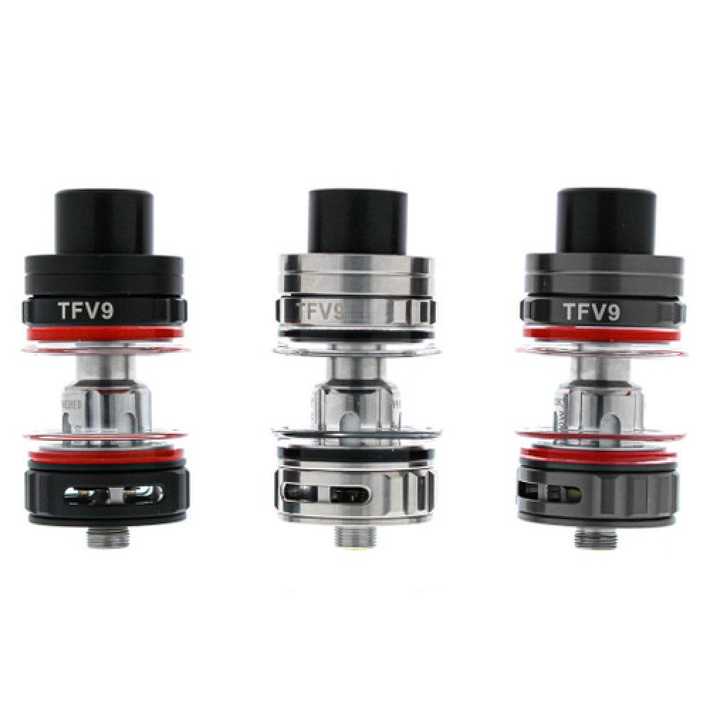 The SMOK TFV9 Sub Ohm Tank measures 28mm in diameter and features a sliding top fill design with a 6.5ml E-Liquid capacity. The TFV9 utilizes V9 Mesh coils which produce fantastic flavor and vapor due to the wide surface area of mesh wire. In addition, the SMOK TFV9 features dual adjustable bottom airflow control and is compatible with 810 drip tips.